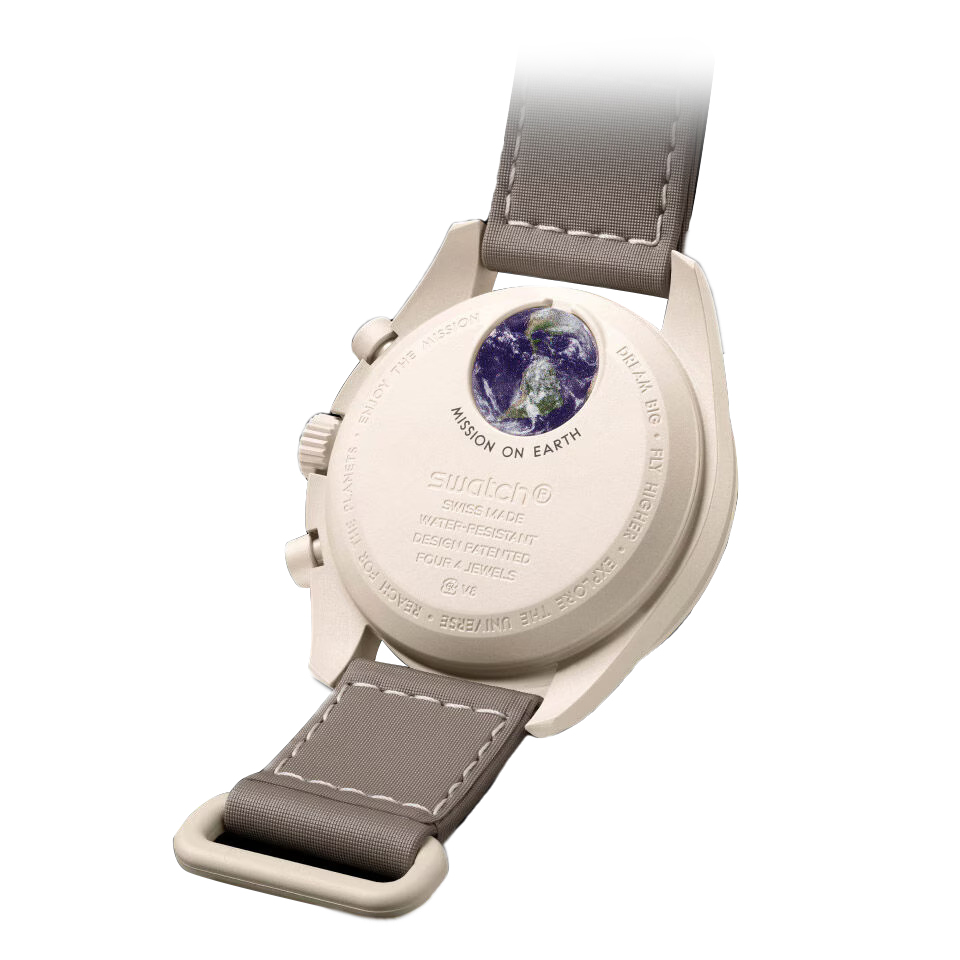 This non-limited watch boasts a sand-colored Bioceramic case, crown and pushers and a greige (taupe) VELCRO® strap with contrasting sand-colored topstitching. It features a greige (taupe) dial with sand-colored hands. The subdials feature Arabic numerals and indexes in a radial format, as a nod to the Speedmaster Alaska II and III projects. The greige (taupe) bezel is adorned with a sand-colored tachymeter scale. All dials in the collection carry the OMEGA X Swatch branding, the iconic Speedmaster logo and MoonSwatch logo. The box-shaped biosourced glass construction, the etched "S" integrated in the center of the glass, the fine and sophisticated circular pattern on the dial outer ring and the recessed subdials, the angular and smooth lugs construction, the iconic “dot over 90” detail on the tachymeter scale, and of course the unique Bioceramic feel are common to all models. The hour hand and markers, the minute hand as well as the tip of the chronograph seconds hand sport Super-LumiNova® (green emission) for a perfect glow in the dark.